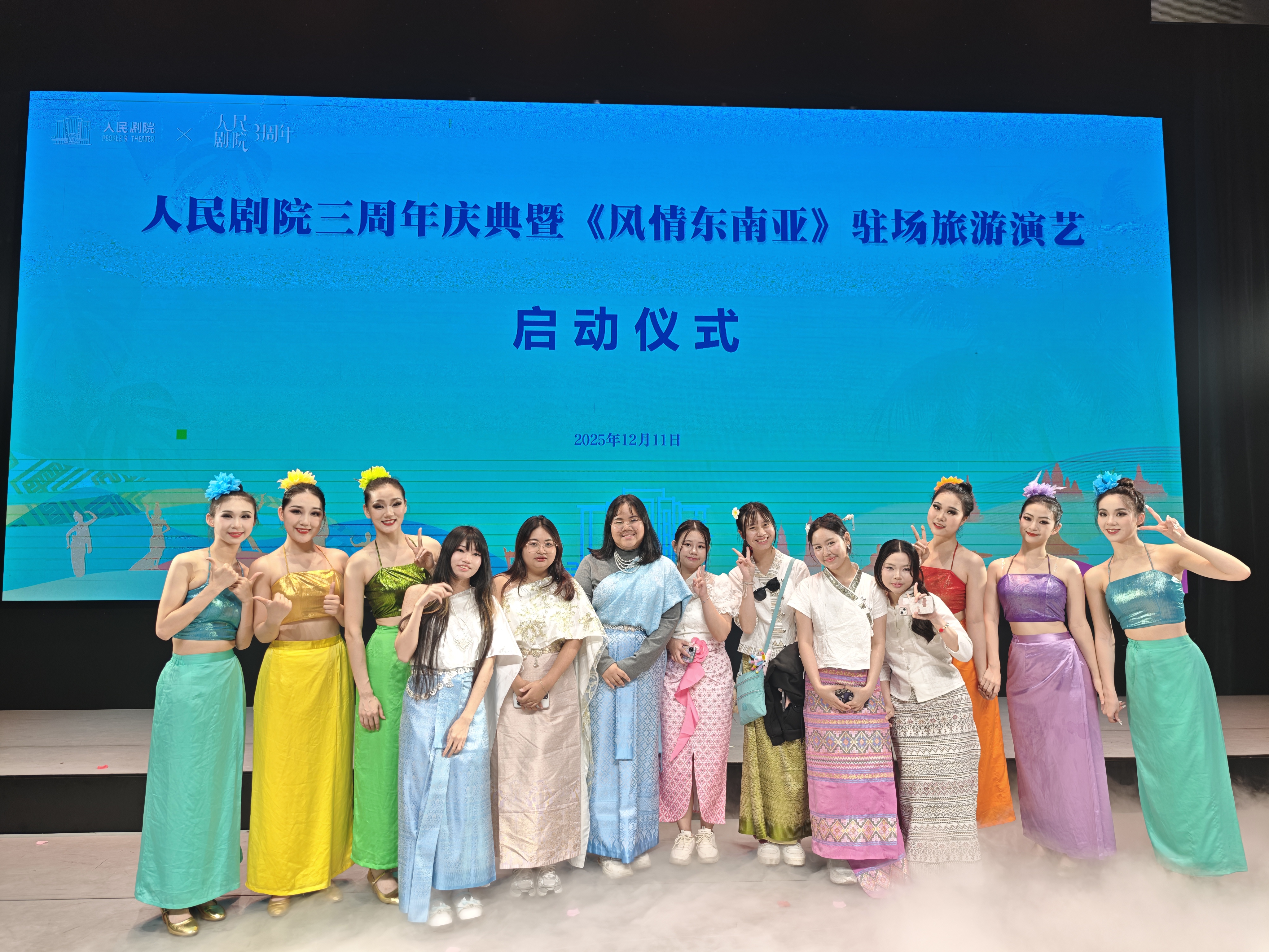 12月11日晚上,“南宁人民剧院三周年庆典暨《风情东南亚》驻场旅游演艺启动仪式”在三街两巷人民剧院举行。广西外国语学院国际教育学院师生受邀参加仪式,泰国留学生身着本国传统服饰,与其他嘉宾共同见证了这一文化盛事,并现场观看了大型情景音画《风情东南亚》的驻场首演。