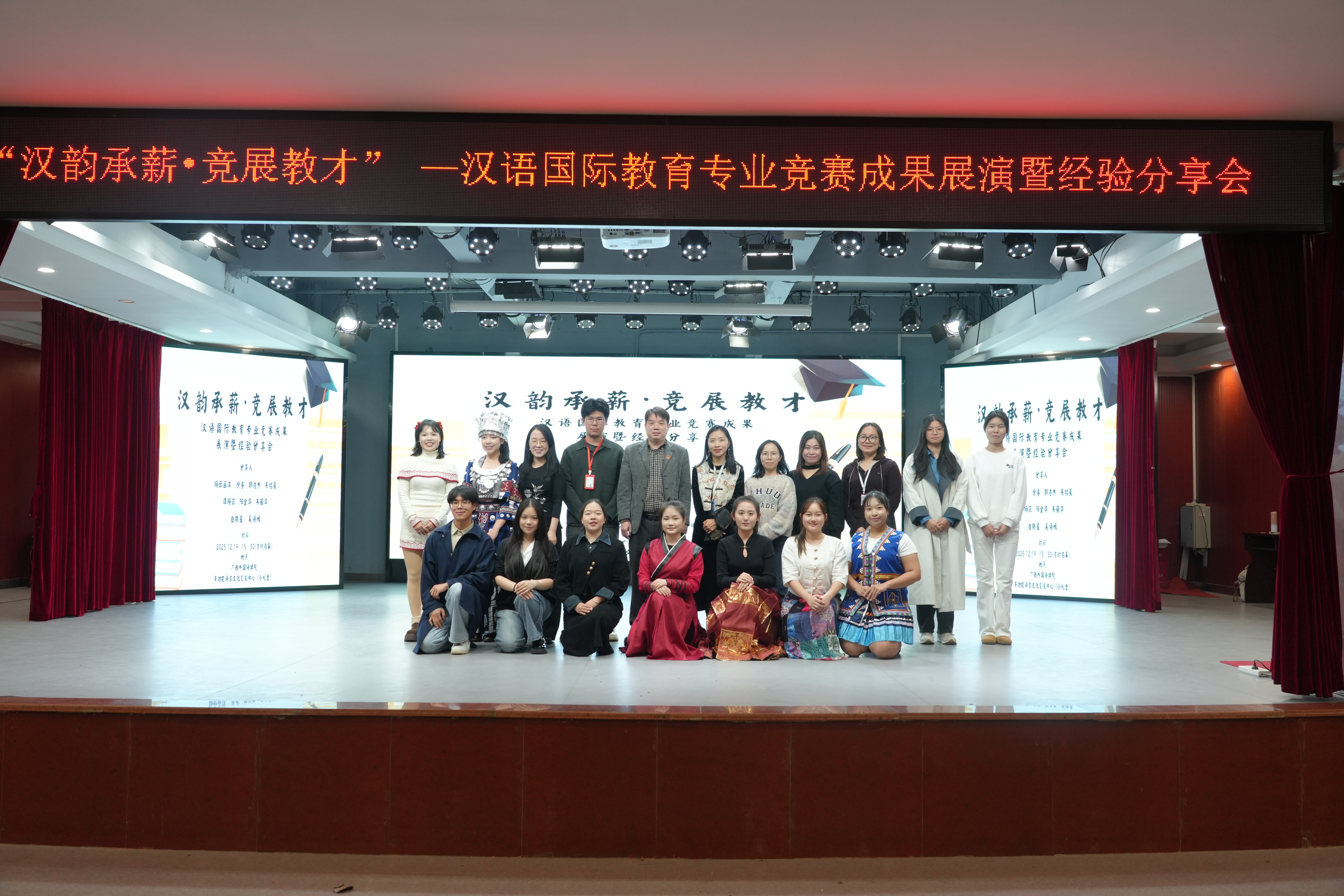 12月19日下午,国际教育学院在语言交流综合训练中心开展以“汉韵承薪·竞展教才”为主题的汉语国际教育专业竞赛成果展演暨经验分享会。活动邀请我院在第三届全国国际中文教育教学技能大赛及第六届广西高校国际中文教育教学技能大赛中获奖的九位中外学子进行分享。国际教育学院党总支书记兼国际交流处处长张云志、学院副院长唐瑛琪出席,学院全体教师和汉语国际教育专业学生参会。