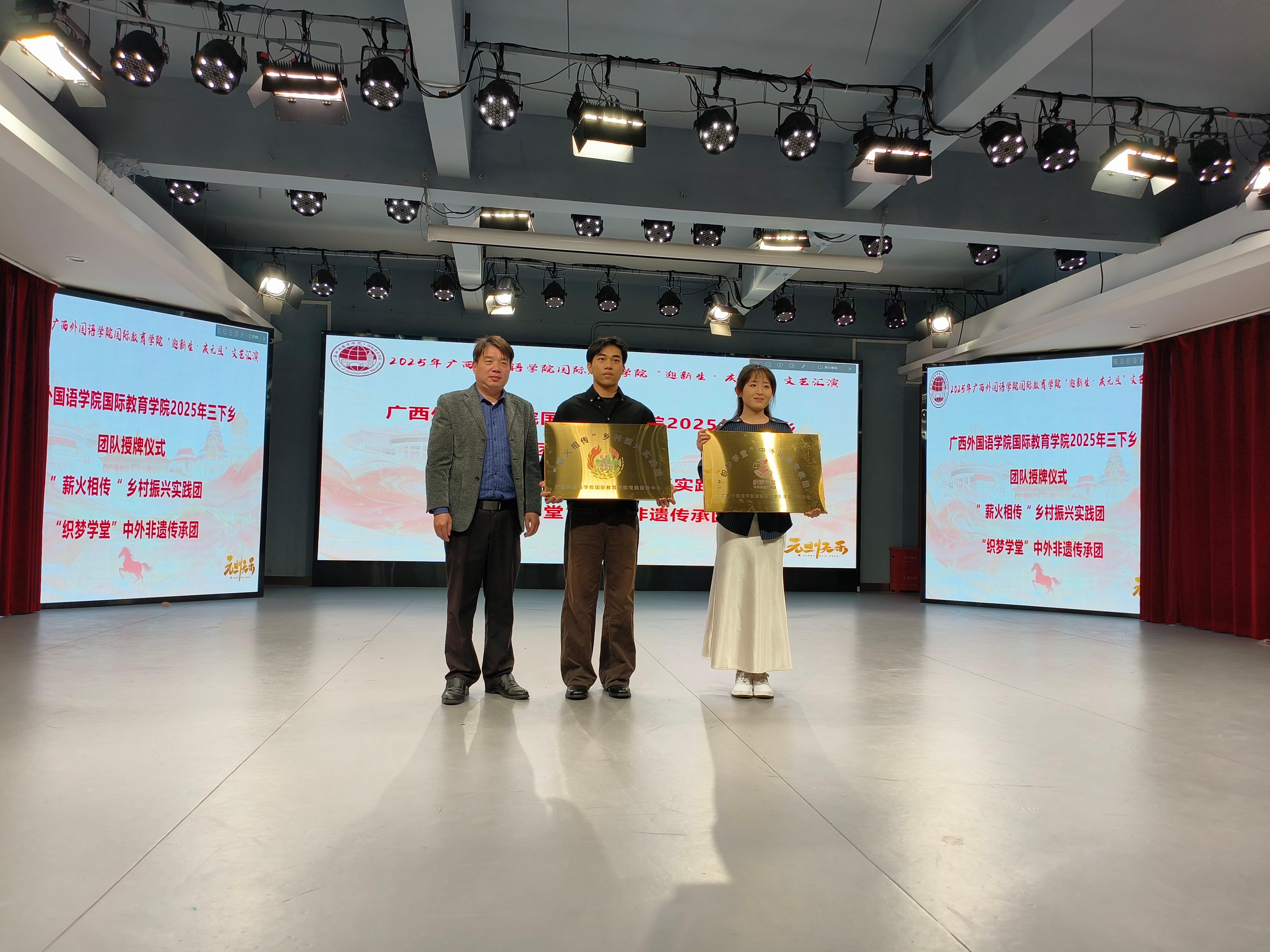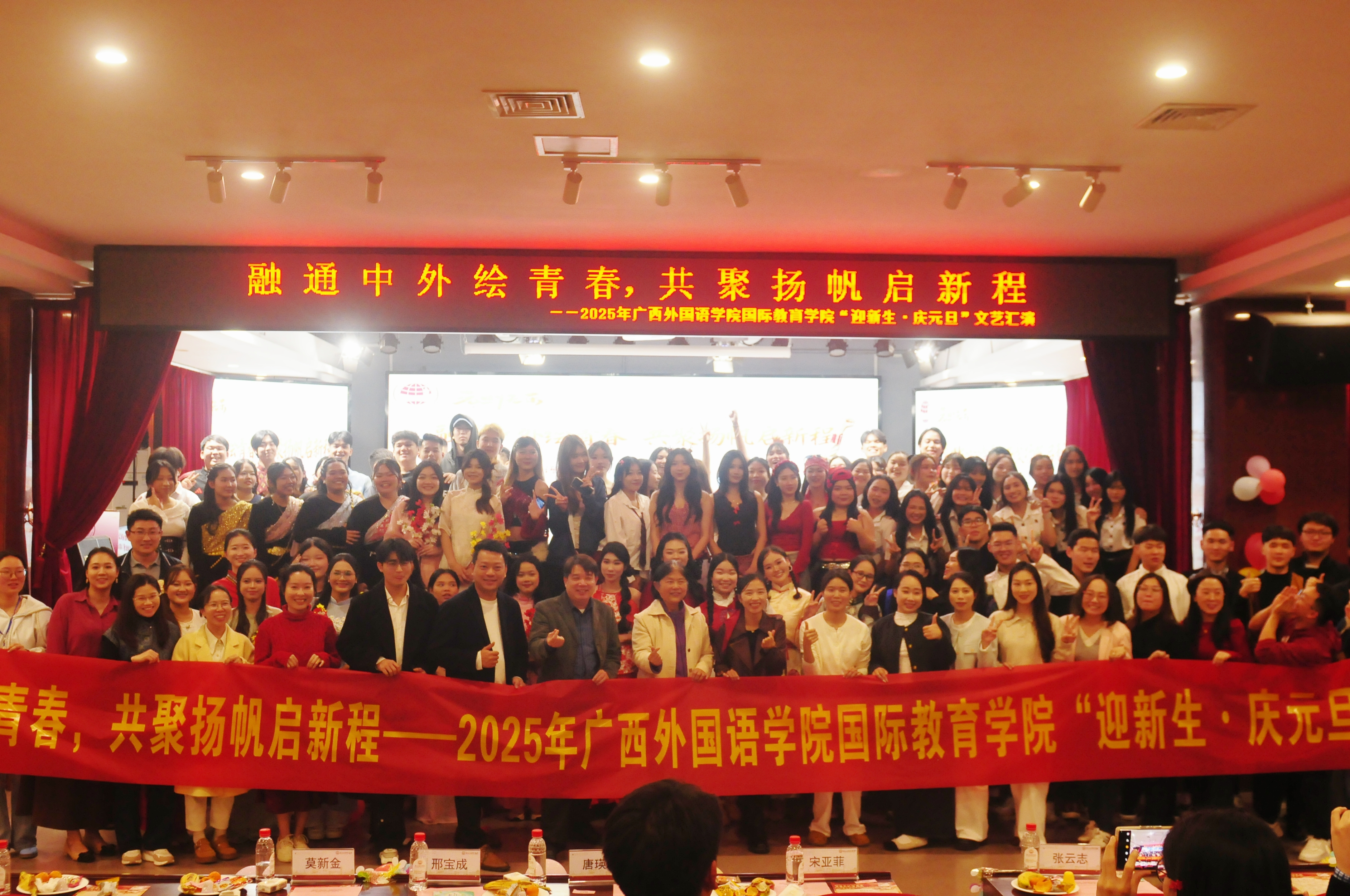 新元肇启,世界同行。2025年12月30日下午,广西外国语学院国际教育学院在语言交流综合训练中心举办“迎新生·庆元旦”文艺汇演。学校督导团总督导兼欧美语言文化学院院长宋亚菲教授莅临现场,国际教育学院党总支书记兼国际交流处处长张云志、副院长唐瑛琪出席活动,与全体中外师生共赴一场中外交融、青春当“燃”的文化盛宴。