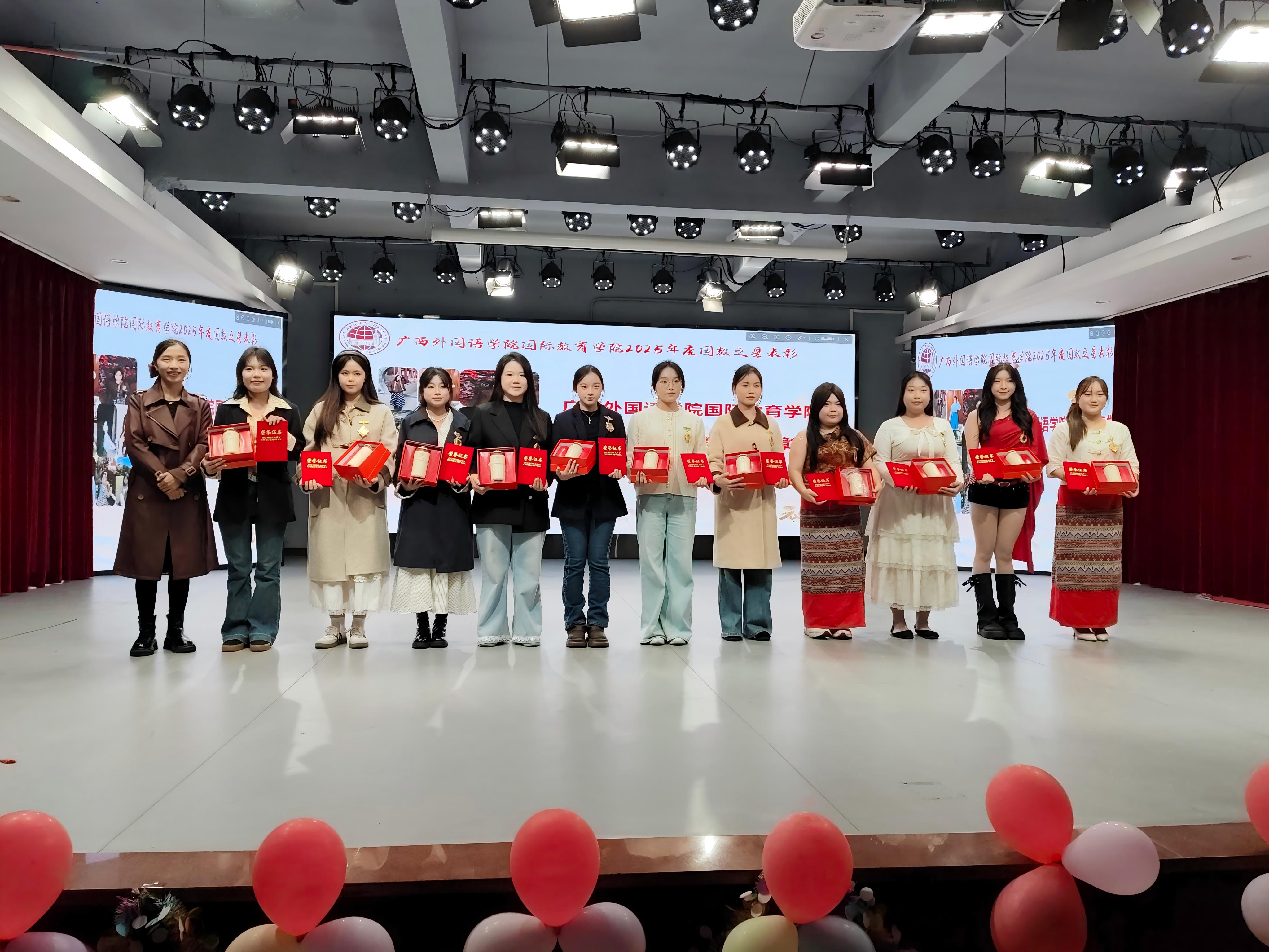 2025年是学院的丰收之年,学院师生在各大赛事和活动中展露风姿,为国际教育事业发展注入蓬勃力量。为表彰先进,激励来者,学院评选出12位优秀学生代表,授予“国教之星”荣誉称号,并对三下乡团队、“互联网+”大赛区级铜奖团队、水灯节活动中的优秀学生代表,以及表现出色的留学生代表予以表彰与掌声。愿全体中外学子以榜样为镜,砥砺前行,争创辉煌。