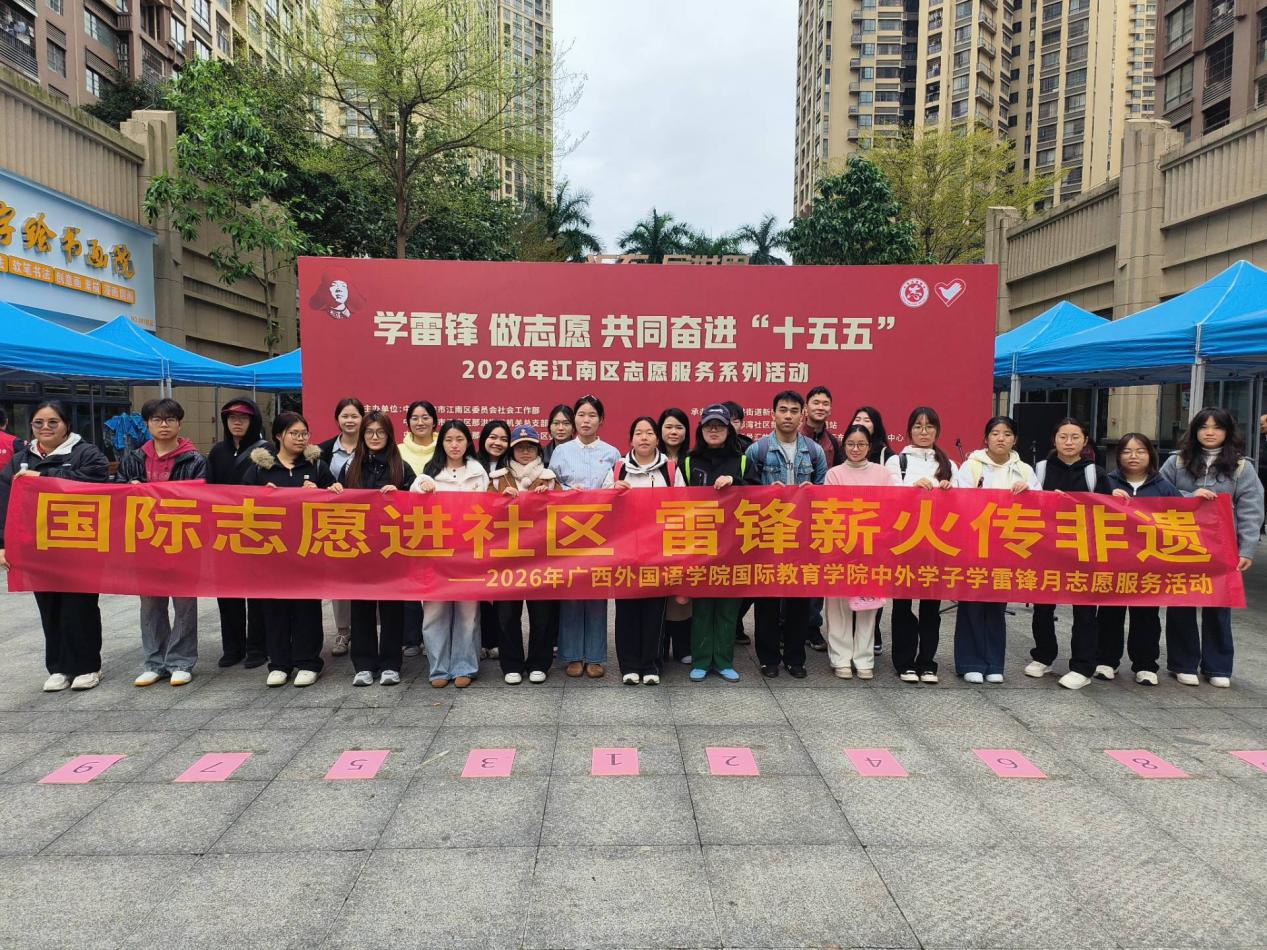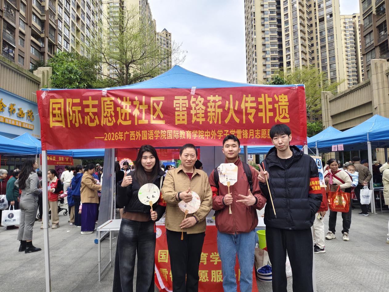 为深入践行“奉献、友爱、互助、进步”的志愿精神,传承尊老爱幼的中华传统美德。3月10日上午,国际教育学院组织26名中国、泰国、越南、蒙古等国家学子走进南宁市江南区北部湾社区开展“国际志愿进社区 雷锋薪火传非遗”学雷锋志愿活动,融入非遗漆扇制作、关爱社区老人、科普安全知识等系列活动,把最走心的温暖与敬意,真切送到每一位社区居民身边,以青春行动传承新时代雷锋精神。活动现场暖意融融。